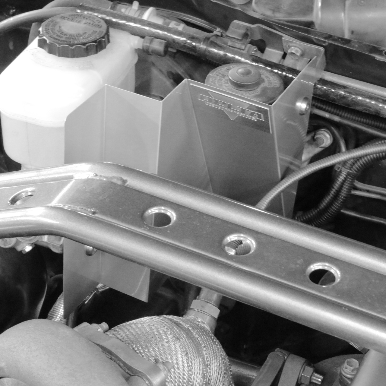 ハイパワーを求め、大きなタービンに交換した際、その発熱量は甚大なものとなります。トヨタJZ系エンジン搭載車両の場合、エキゾースト側にブレーキマスターシリンダー、クラッチシリンダーが配置されており、熱害を受けやすくなっています。DELTAヒートインシュレーターは、その熱害からクラッチ・ブレーキマスターシリンダーを守るために開発されました。
